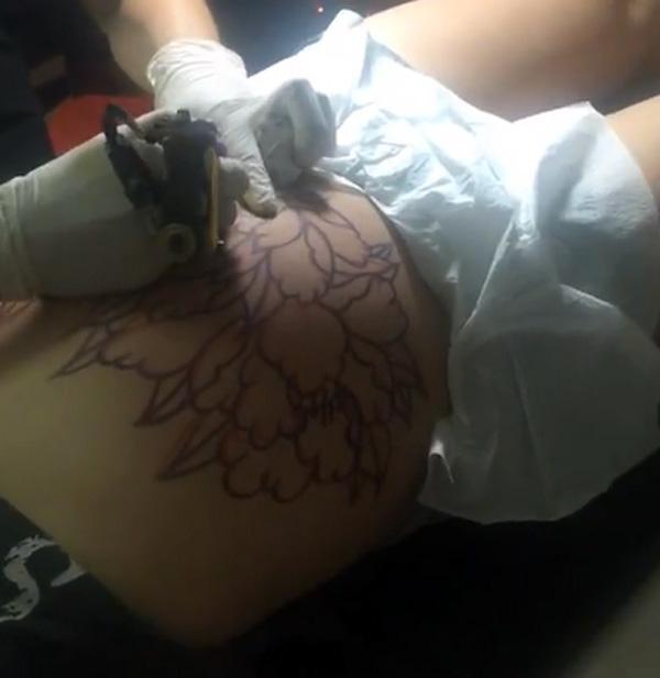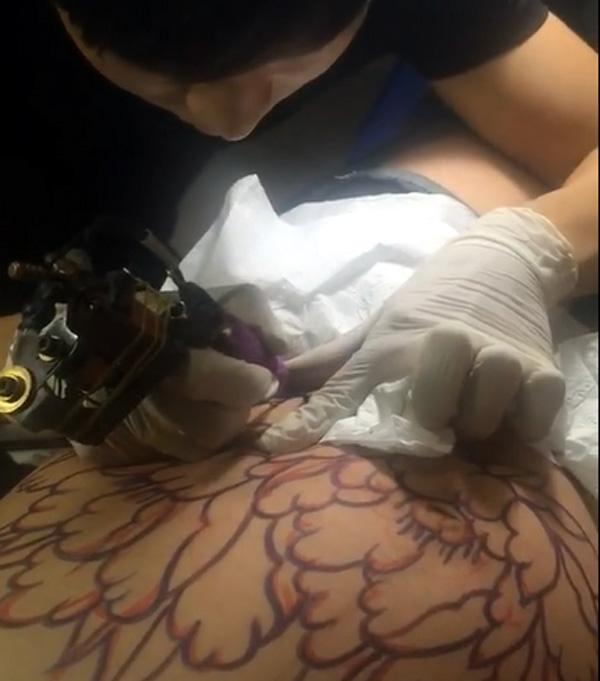 Người thợ xăm đã nhanh chóng bắt tay vào công việc của mình. Công đoạn vẽ cũng mất khá nhiều thời gian bởi hình hoa mẫu đơn khá cầu kỳ và đòi hỏi các tiểu tiết tỉ mỉ.