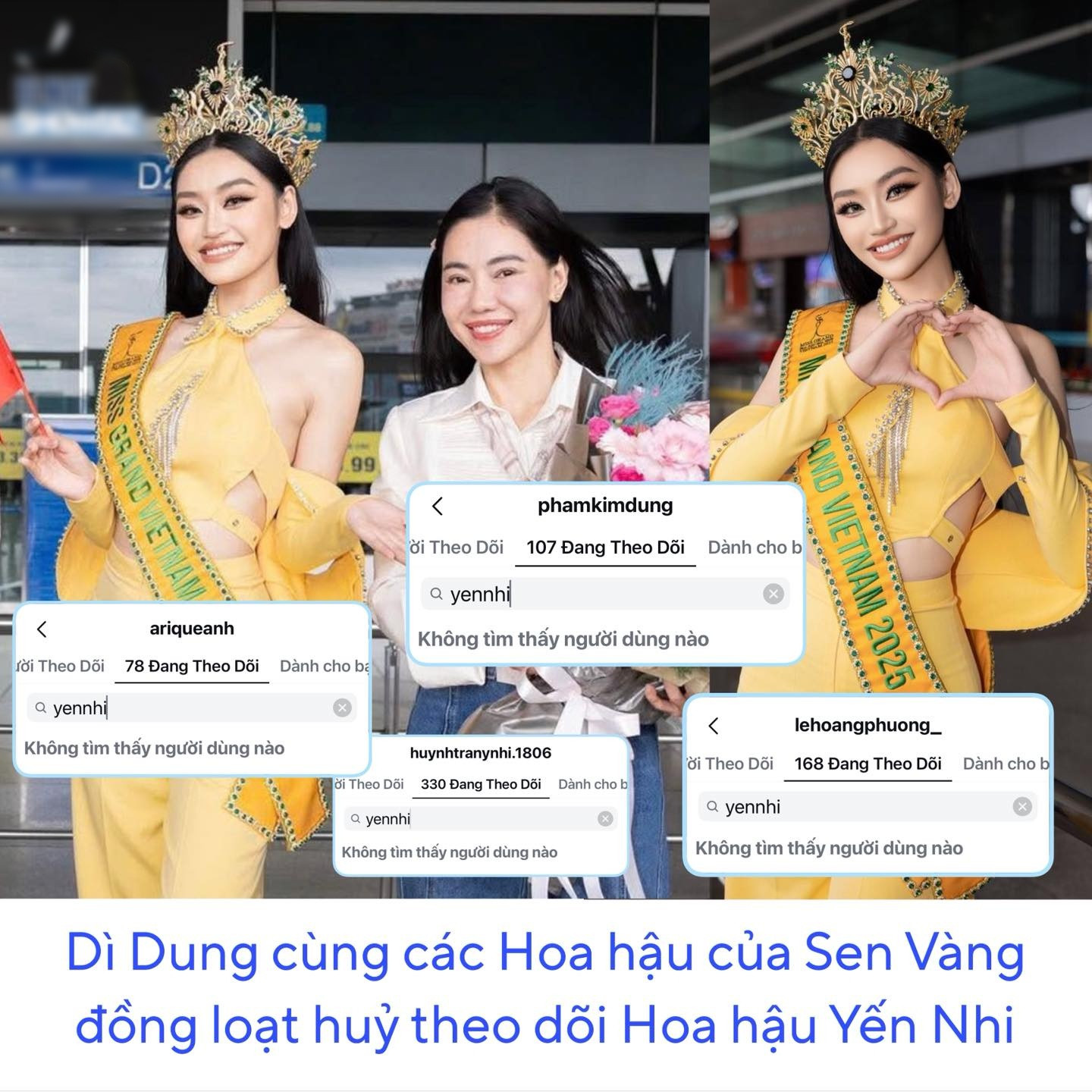 Đến trưa 5/10, bà trùm hoa hậu Phạm Kim Dung và các Hoa hậu nhà Sen Vàng như Ý Nhi, Quế Anh, Lê Hoàng Phương đều đồng loạt hủy theo dõi Yến Nhi trên trang instagram cá nhân.
