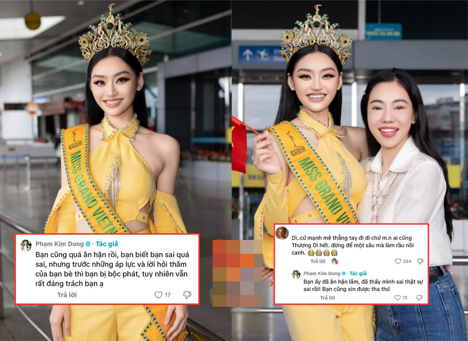 Tuy nhiên, mới đây, bà Dung đã có động thái "xoa dịu" quay xe. Phía dưới bài đăng, "bà trùm hoa hậu" để lại loạt bình luận: "Bạn cũng quá ân hận rồi, bạn biết sai quá sai nhưng trước những áp lực và lời hỏi thăm của bạn bè thì bạn bị bộc phát, tuy nhiên vẫn rất đáng trách", "Bạn ấy đã ân hận lắm, đã thấy mình sai thật sự, bạn cũng xin được tha thứ"...