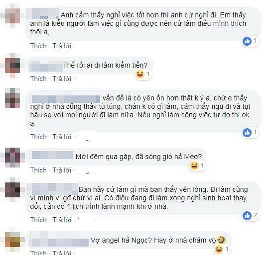 Dưới bài viết, rất nhiều người cũng khuyên Trần Ngọc nên bình tĩnh suy nghĩ lại và không nên nghỉ việc. "Suy nghĩ lại. Ai xui cháu nghỉ việc cho gia đình yên ổn hơn đấy. Cái gì quá cũng không tốt. Nghỉ việc hẳn theo cô hiểu cạp đất mà ăn à. Kể cả con cháu tỷ phú không ai như vậy"; "Đàn ông hãy lấy sự nghiệp làm trọng. Gia đình là nơi ta được sinh ra và tổ ấm do ta lựa chọn. Hãy suy xét trước khi lựa chọn Ngọc nhé"; "Bạn hãy cứ làm gì mà bạn thấy yên lòng. Đi làm cũng vì mình vì gia đình chứ vì ai. Có điều đang đi làm xong nghỉ sinh hoạt thay đổi, cần có 1 lịch trình lành mạnh khi ở nhà".