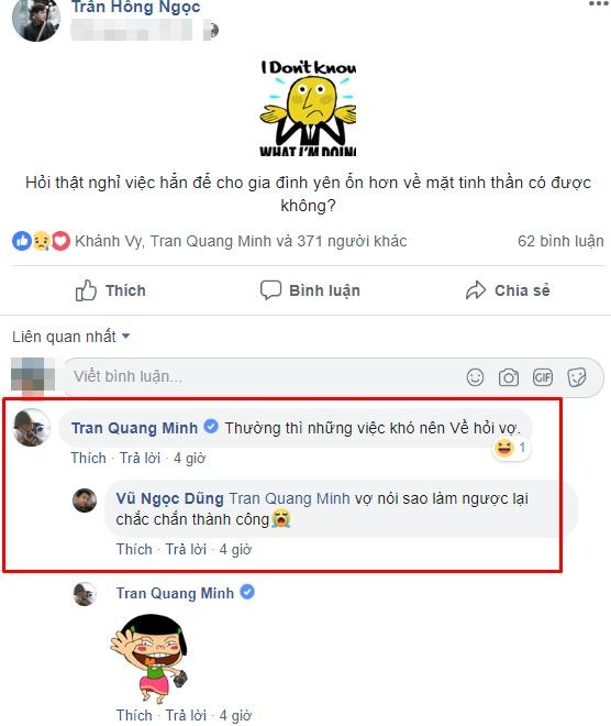 Trạng thái này lập tức thu hút nhiều chú ý của người thân lẫn đồng nghiệp. Trong khi MC Minh Hà, BTV Ngọc Trinh ủng hộ Trần Ngọc nghỉ việc khi anh nói lý do "vì vợ" thì MC Quang Minh lại khuyên MC họ Trần nên hỏi ý kiến bà xã: "Thường thì những việc khó nên về hỏi vợ".