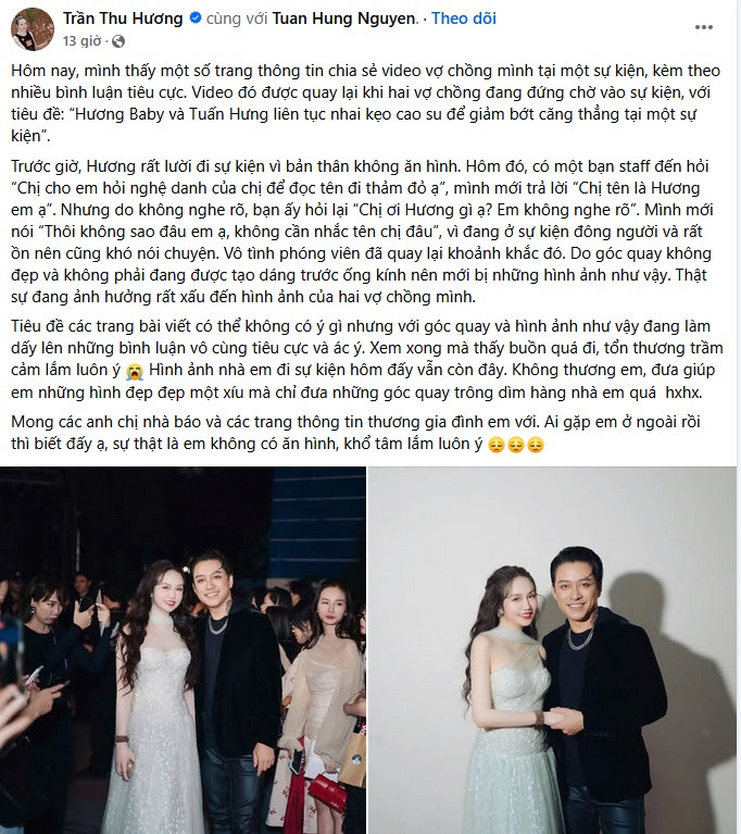 Cách đây ít giờ, Hương Baby đã chính thức lên tiếng trên trang cá nhân. Cô viết: