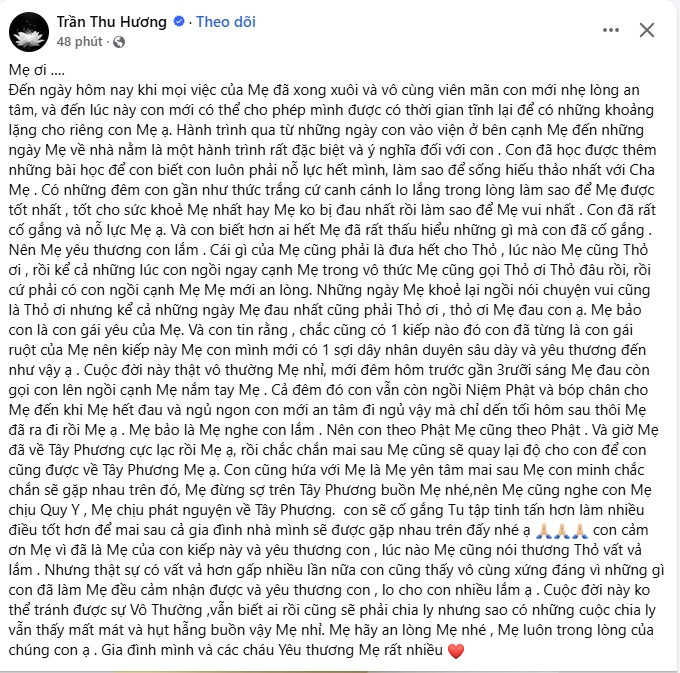 Cô viết: "Mẹ ơi… Đến ngày hôm nay khi mọi việc của Mẹ đã xong xuôi và vô cùng viên mãn con mới nhẹ lòng an tâm, và đến lúc này con mới có thể cho phép mình được có thời gian tĩnh lại để có những khoảng lặng cho riêng con Mẹ ạ. Hành trình qua từ những ngày con vào viện ở bên cạnh Mẹ đến những ngày Mẹ về nhà nằm là một hành trình rất đặc biệt và ý nghĩa đối với con.