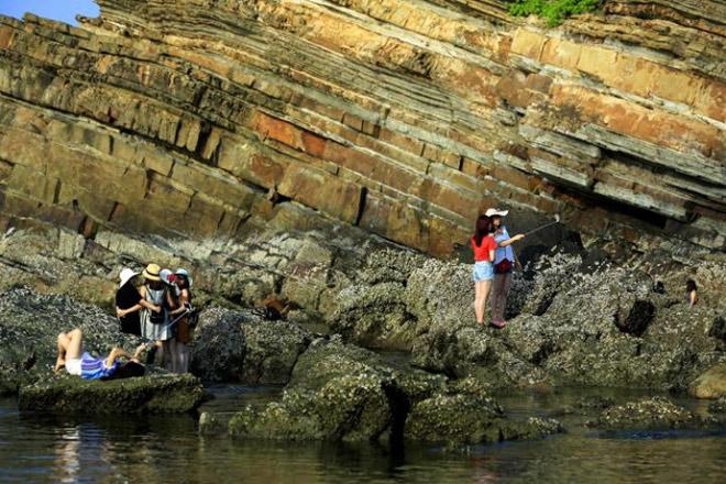 Du khách thích thú tham quan, chụp ảnh lưu niệm tại bãi đá Móng Rồng