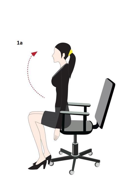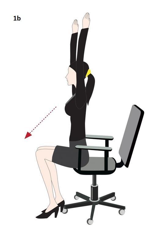 Giữ lưng thẳng, ngồi sát vào ghế, đưa tay lên cao rồi từ từ gập người về phía trước, tay hạ theo ôm hai chân, kéo căng lưng và ngửa cằm lên sao cho bụng chạm đùi. Trở về tư thế ban đầu và lặp lại ít nhất 5 lần (Hình: 1a, 1b, 1c).