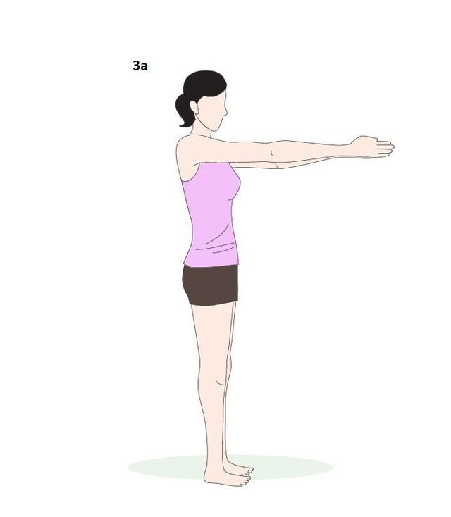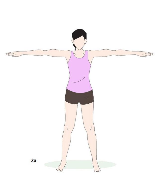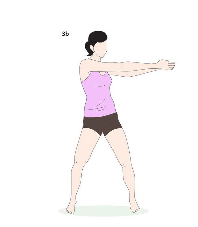 Tư thế 2: đứng thẳng, hai chân mở rộng bằng vai, đầu gối hơi chùng xuống. Hai tay vuông góc với vai, đưa thẳng về phía trước, hai lòng bàn tay úp vào nhau. Vặn người sang trái càng nhanh càng tốt đồng thời giữ cho phần thân dưới (tức từ hông trở xuống) cố định. Đổi bên vặn người sang phải. Mỗi bên 30 lần. Bài tập trên có tác dụng đánh tan phần mỡ dư thừa nơi vùng bụng (Hình: 3a, 3b).