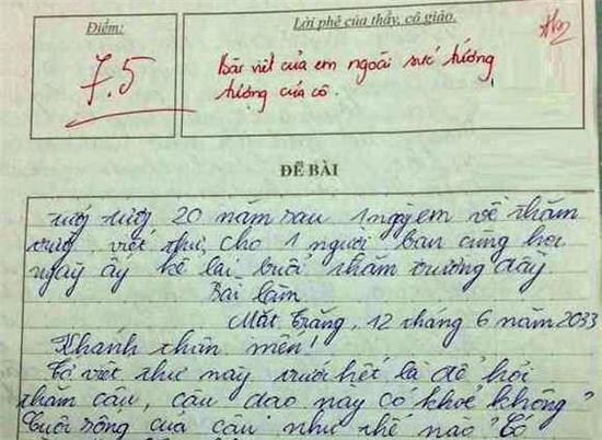 Đề bài yêu cầu tưởng tượng và viết một bức thư cho người bạn học cũ trong lần về thăm trường sau 20 năm. Bằng sự sáng tạo độc đáo, học sinh này đã khiến cô giáo phải bất ngờ, đưa ra nhận xét "Bài viết cô em ngoài sức tưởng tượng của cô".