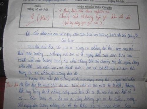 Bài văn dù rất dài nhưng chỉ được 2 điểm kèm theo lời phê của giáo viên: "Ý thức làm bài chưa nghiêm túc, chú ý cách sử dụng ngôn ngữ khi viết văn, không dùng ngôn ngữ nói".