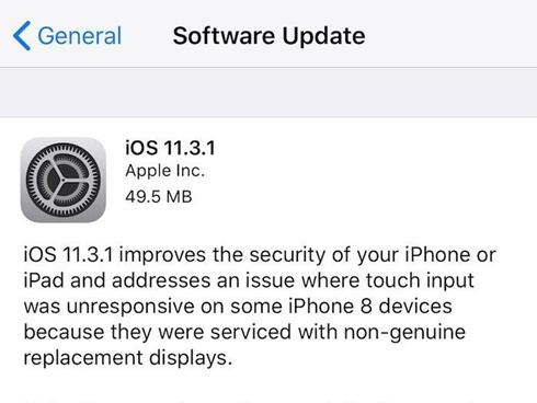 Trước đó một số chủ sở hữu iPhone đã sửa lại màn hình bởi bên thứ ba, cho biết màn hình cảm ứng của họ trở nên nhạy cảm sau khi cập nhật iOS 11.3 được tung ra gần đây. Với bản cập nhật iOS 11.3.1 mới nhất, Apple đã khắc phục vấn đề này, đồng thời cảnh báo người dùng không sử dụng "màn hình thay thế không chính hãng". Theo Apple đây chính là nguyên nhân gây nên những khó khăn cho người dùng iPhone 8 gặp phải.