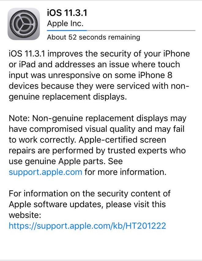 Hôm thứ 3 vừa qua Apple đã phát hành bản cập nhật iOS 11.3.1, bao gồm cả việc khắc phục việc một số màn hình cảm ứng của iPhone 8 mà công ty chưa kịp phản hồi.