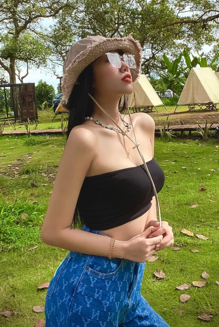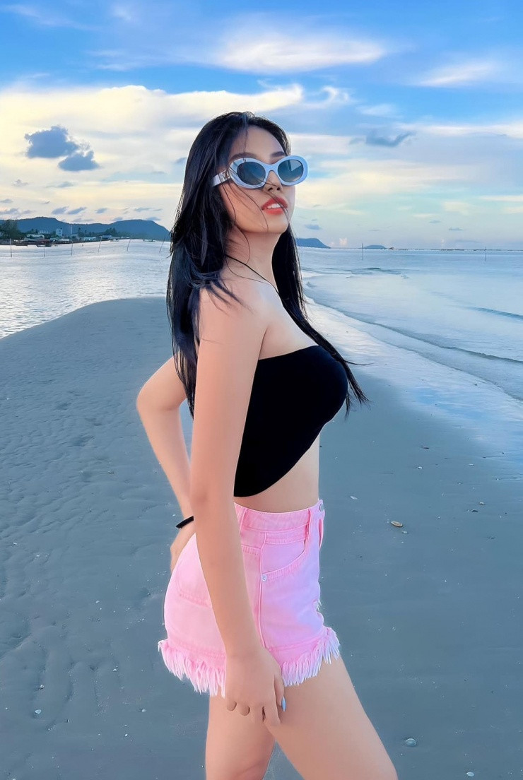 Bạn gái Quang Minh mặc áo quây cùng quần shorts siêu ngắn, tôn số đo 3 vòng khi đi biển.