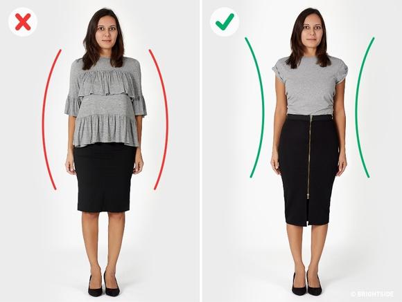Nếu bạn sa đà vào việc lựa chọn chiếc áo thiết kế cầu kỳ, có nhiều trang trí đường diềm thì sẽ tự "làm hại" mình. Chắc chắn, thân hình bạn sẽ trông vô cùng cồng kềnh, mũm mĩm. Khi mặc chân váy bút chì thì bạn nên mặc một chiếc áo đơn giản, vừa vặn sẽ tạo cái nhìn thanh lịch hoàn mỹ.