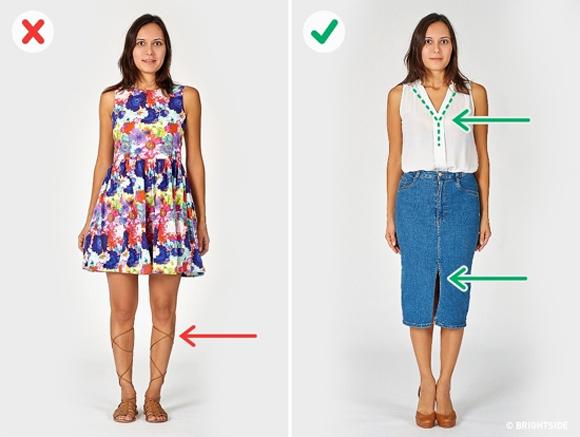 Bạn sẽ trông nặng nề và béo tròn hơn khi lựa chọn váy họa tiết dáng xòe kết hợp xăng đan bệt dây buộc. Để ăn gian chiều cao, thì một chiếc áo cổ chữ V tạo đường khe giữa, chân váy xẻ giữa và giày cao gót sẽ là hợp nhất.