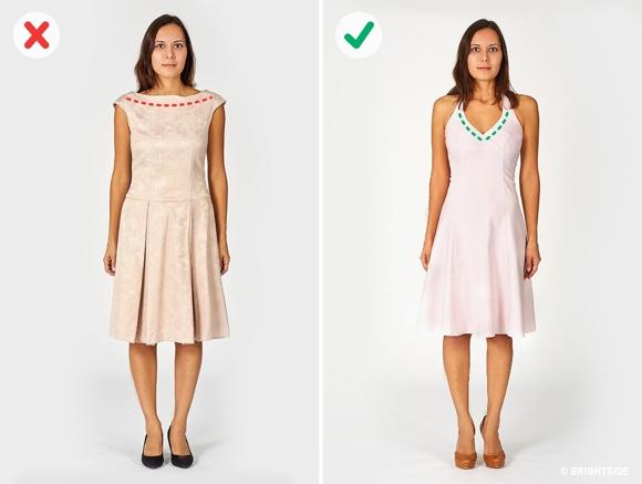 Thiết kế váy áo cổ thuyền sẽ dễ làm người bạn to ngang và lùn đi. Chỉ cần một "chiêu trò" nhỏ với váy áo cổ khoét sâu, bạn đã tự "kéo dài" vóc dáng. Ngoài ra, thiết kế váy có đường cắt hạ eo thấp cũng khiến bạn kém xinh hơn những chiếc váy ôm sát gọn gàng.