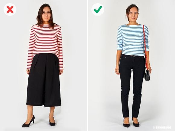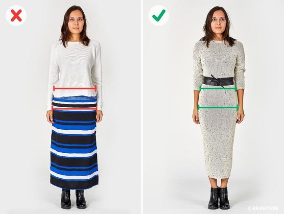Dễ nhìn thấy, kẻ sọc ngang to bản sẽ làm cho phần dưới của bạn kém thon gọn. Tồi tệ hơn là khi bạn kết hợp chúng với một chiếc áo dáng suông rộng. Nếu bạn đang muốn tạo cái nhìn yêu kiều, thanh lịch thì hãy lựa chọn ngay chiếc váy gam một màu, có thắt lưng tạo điểm nhấn tại eo nhé.