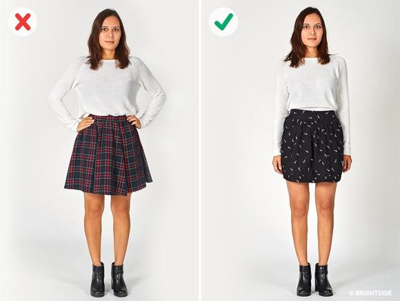 Kẻ sọc tuy sành điệu và mang lại cái nhìn trẻ trung, tươi mới nhưng bạn cũng nên cẩn trọng khi lựa chọn. Những chiếc váy kẻ sọc to bản sẽ dễ làm cho phần dưới của bạn trông thô và mất hết đường cong. Thay vì lựa chọn váy kẻ sọc to bản, bạn có thể "làm thân" với chiếc chân váy màu trung tính, họa tiết đơn giản. Nếu có đam mê với kẻ sọc thì bạn chỉ nên mặc kẻ sọc nhỏ thanh mảnh nhé.