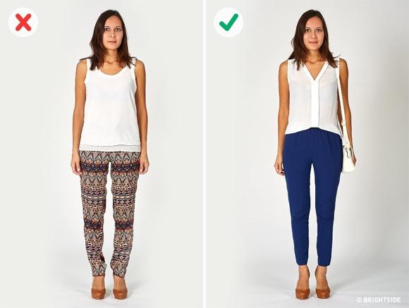 Để tạo cái nhìn cao ráo hơn về thân hình, bạn nên lựa chọn một chiếc áo cổ chữ V, có điểm nhấn viền cổ áo kéo xuống giữa ngực. Chiếc quần gam một màu kết hợp với áo cổ chữ V sẽ khiến bạn thanh thoát hơn hẳn khi mặc quần họa tiết và áo cổ tròn.