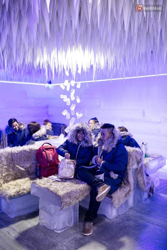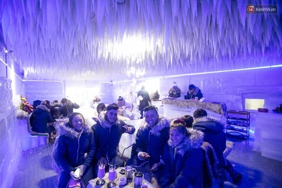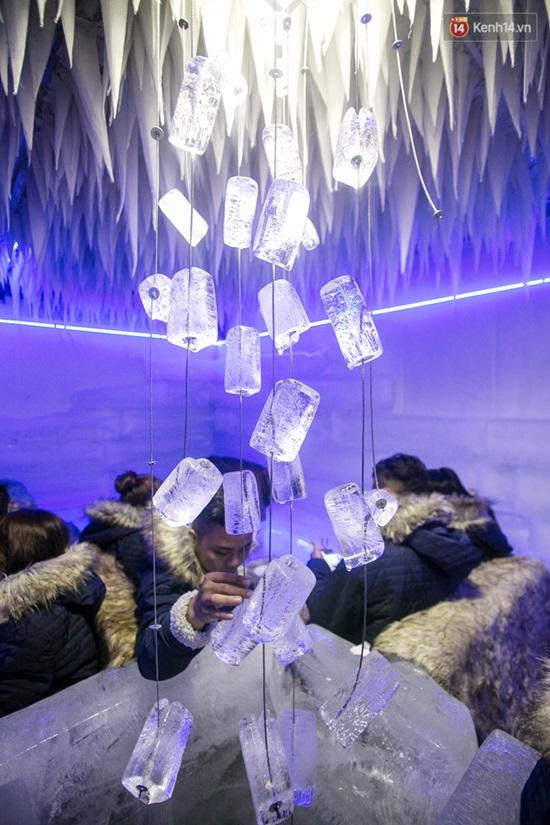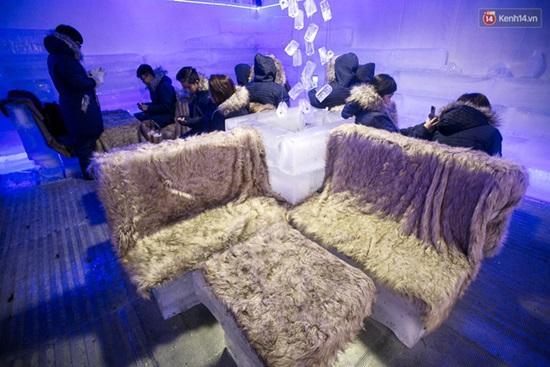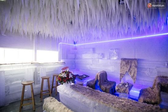 Khi vào được bên trong, bạn sẽ đi từ ngạc nhiên này đến ngạc nhiên khác khi thấy toàn bộ nội thất bên trong quán đều được làm từ băng. Thậm chí bàn ghế, quầy bar, kệ tủ, hay những chiếc đèn chùm được treo trên trần,... tất cả đều được làm từ băng. Và để giữ ấm, trên mỗi bàn và ghế đều được phủ bằng một lớp vải lông dày tạo cảm giác êm hơn khi ngồi và không cảm thấy bị khó chịu vì quá lạnh.