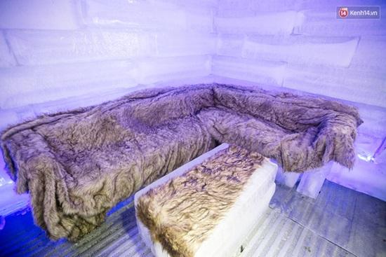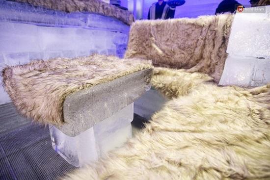 Bàn ghế, tủ kệ đều được làm từ những tảng băng và được phủ thêm thảm da để cách nhiệt.