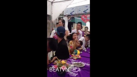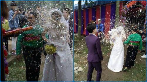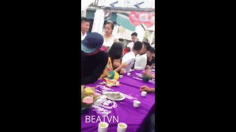 Cả quả pháo giấy đã phụt thẳng vào mặt cô dâu khiến cô ngay lập tức ôm mặt vì bị giật mình và choáng.