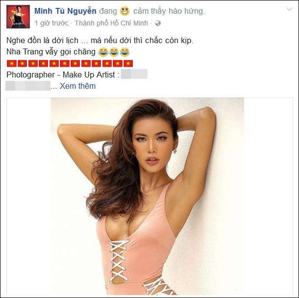 Theo dòng trạng thái "thả thính" của Minh Tú, có thể cuộc thi Hoa hậu Hoàn vũ Việt Nam 2017 sẽ dời lại lịch tuyển sinh. Nếu thông tin này là chính xác, cô vẫn có thể kịp thời ghi danh vào cuộc tranh đua.