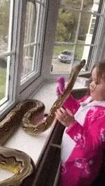Cô bé cầm một thứ đồ chơi nhựa và đùa nghịch với con trăn một cách tự nhiên. Khi con trăn lè lưỡi ra khiến người ta tưởng cô bé sẽ bị tấn công nhưng sự việc lại diễn ra một cách trái ngược. Con trăn ghé vào vai cô bé và hai bên ôm nhau một cách tình cảm như những người thân thiết.