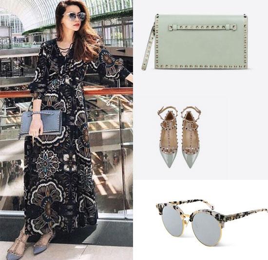 Cô diện bộ váy maxi dáng dài sang trọng mix với túi và giày của Valentino,
