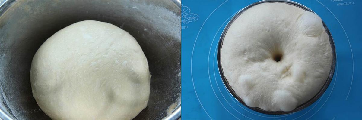 Rây bột mì vào âu, thêm men nở trộn đều tiếp đó cho đường, sữa tươi, trứng và nước vào nhào thành khối bột đồng nhất. Thêm bơ đã làm mềm vào nhào chung thành khối bột mịn không dính tay. Cho khối bột vào âu che phủ lại rồi ủ lên men cho tới khi bột nở gấp đôi.