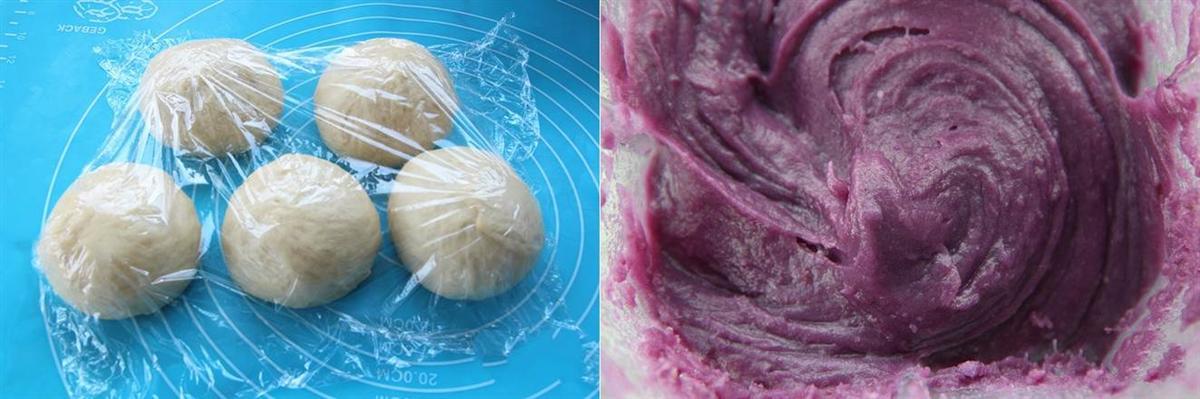 Sau khi bột nở bạn lấy bột ra nhào qua rồi chia khối bột thành 5 phần, mỗi phần khoảng 150g. Vo tròn từng phần bột và để bột nghỉ khoảng 15 phút. (Bạn che phủ bột bằng màng bọc thực phẩm hoặc khăn ẩm). Khoai lang tím hấp chín, nghiền mịn.