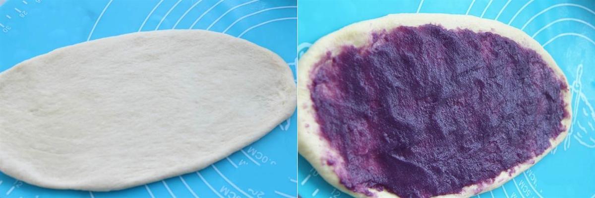 Bột sau khi nghỉ bạn cán thành tấm bột hình bầu dục. Phết một lớp khoai lang tím đã nghiền lên trên tấm bột