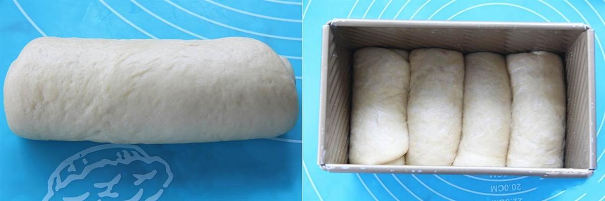 Cuộn tròn tấm bột lại. Bạn làm tương tự với phần bột còn lại. Cho bột đã cuộn vào khuôn nướng. Tiến hành ủ bột thêm lần nữa cho đến khi bột nở chiếm khoảng 80% khuôn thì đem đi nướng. Nướng bánh ở 180 độ C trong khoảng 30-35 phút là bánh chín. (Bạn nhớ làm nóng lò trước khi cho bánh vào nướng).