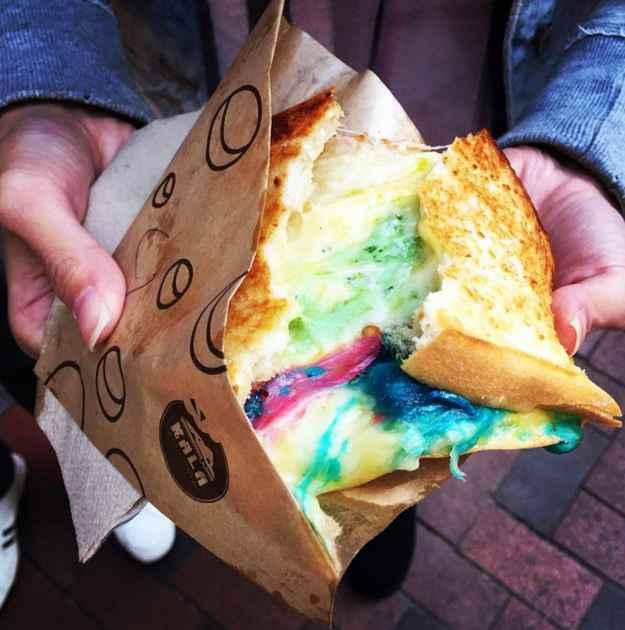 Bánh mì nướng kẹp phô mai cầu vồng đầy màu sắc.