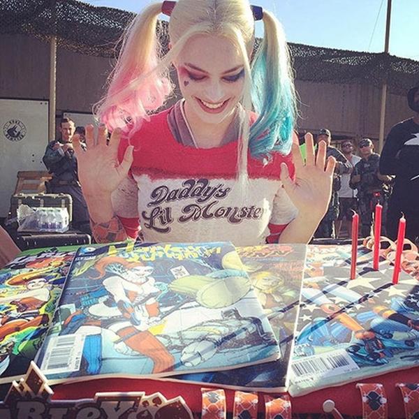Nữ diễn viên Margot Robbie được tặng chiếc bánh sinh nhật phủ đầy những quyển truyện tranh với hình ảnh nhân vật cô đang thủ diễn - Harley Quinn.