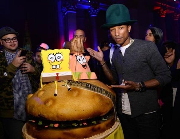 Pharrell Williams bên bánh sinh nhật tạo hình chiếc hambuger khổng lồ và hai nhân vật hoạt hình nổi tiếng mừng tuổi 41.