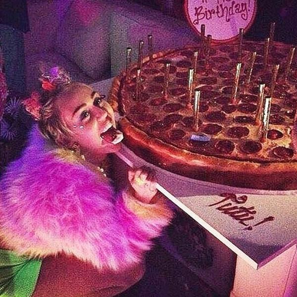 Cô nàng nổi loạn Miley Cyrus tạo dáng vui vẻ bên chiếc bánh sinh nhật khổng lồ tại một hộp đêm nhân sinh nhật lần thứ 22.