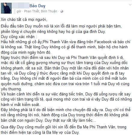 Tuy nói không thanh minh hay biện hộ gì cho bản thân nhưng ông xã Phi Thanh Vân đã trải lòng để mọi người hiểu hơn về giây phút nóng giận của bản thân. Theo như Bảo Duy, xảy ra sự việc đáng tiếc đêm 30 là do tinh thần sa sút, tâm trạng tồi tệ xuống dốc không phanh vì nhớ thương con trai, tiếc nuối hôn nhân và đặc biệt là trong người có hơi men nên đã không khống chế được mình.