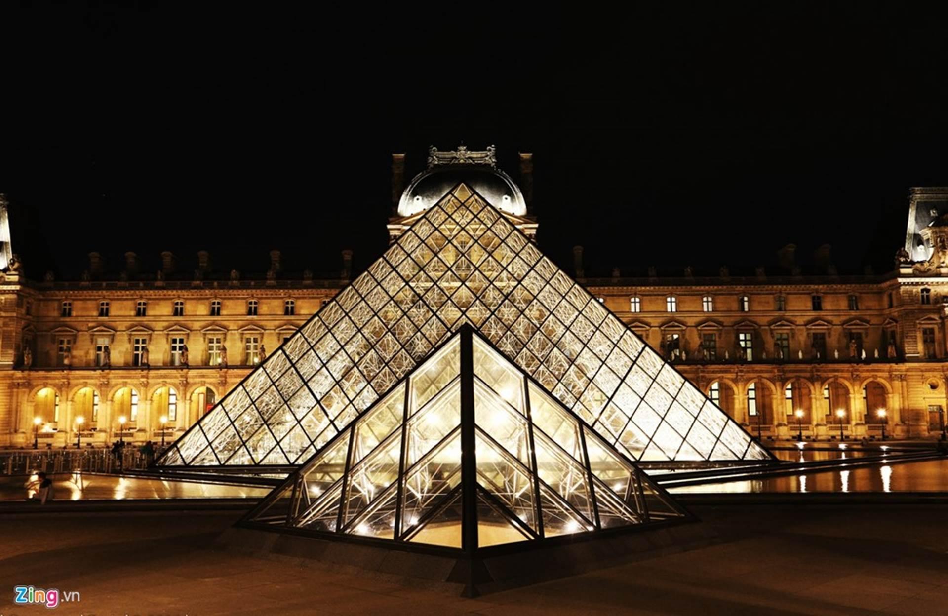 Vào ban đêm, bảo tàng lung linh trong ánh sáng. Kim tự tháp kính nổi bật rực rỡ.
