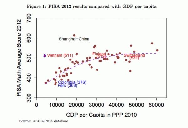 Trong số 8 nước đang phát triển tham gia chương trình, Việt Nam có GDP đầu người thấp nhất, 4.098 USD. Tuy nhiên, thành tích của học sinh Việt Nam lại cao hơn nhiều so với các quốc gia khác.
