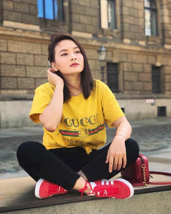 T-shirt màu vàng nổi bật, in logo của một thương hiệu nổi tiếng (giá khoảng 12 triệu đồng) cũng là chiếc áo được Bảo Thanh ứng dụng trong nhiều dịp. Cô thường phối cùng quần jeans màu đen để có vẻ ngoài trẻ trung, cá tính hơn.