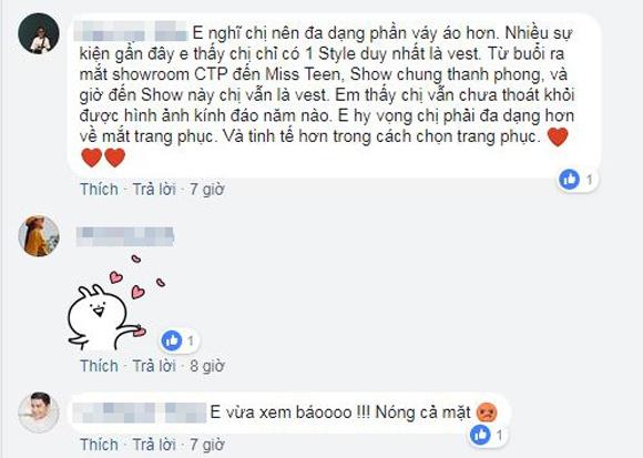 "Em nghĩ chị nên đa dạng phần váy áo hơn. Nhiều sự kiện gần đây em thấy chị chỉ có 1 style duy nhất là vest. Em thấy chị vẫn chưa thoát khỏi được hình ảnh kính đáo năm nào. Em hy vọng chị phải đa dạng hơn về mắt trang phục. Và tinh tế hơn trong cách chọn trang phục", ý kiến khác chia sẻ.