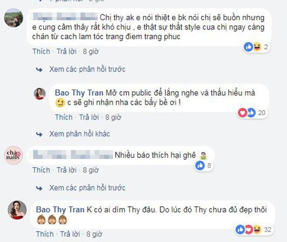 Ngay lập tức, Bảo Thy cũng trả lời: "Mở commet public để lắng nghe và thấu hiểu mà, chị sẽ ghi nhận nha các baby ơi". Ngoài ra, khi nhiều người cho rằng nhiều báo hại Bảo Thy khi chụp ảnh xấu cho cô thì giọng ca Là con gái phải xinh phủ nhận: "Không có ai dìm Thy đâu. Do lúc đó Thy chưa đủ đẹp thôi". Cách đối đáp tinh tế, nhẹ nhàng của Bảo Thy khiến người hâm mộ khen ngợi.
