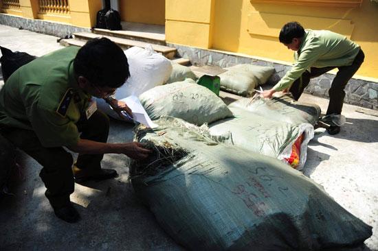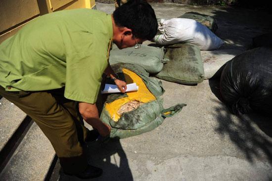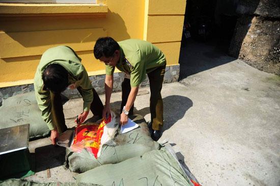 Lực lượng chức năng kiểm tra số dược liệu trong bao tải
