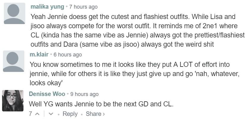 Fan quốc tế cũng phải công nhận rằng Jennie luôn có bộ đồ đáng yêu và gây chú ý nhất. Lisa và Jisoo thì tranh nhau đồ xấu nhất. Thậm chí họ còn so sánh Black Pink với 2NE1 khi mà CL luôn được stylist ưu ái còn Dara là visual thì cũng đồ kỳ cục