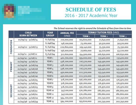 Theo như bảng thông tin của trường quốc tế này, tuổi của Subeo là đang học lớp 1 và học phí 1 năm học là 402.7 triệu đồng. Cụ thể học kỳ 1 là 199 triệu đồng, học kỳ 2 và 3 đều là 137.4 triệu đồng. Hơn thế, bảng tiền học này là chưa bao gồm các tiền dịch vụ, ngoại khóa và các chi phí khác… Vì vậy, nếu tính tổng chi phí cho quý tử nhà Hà - Cường đi học một năm thì con số chắc chắn cũng phải ngót nghét nửa tỷ.
