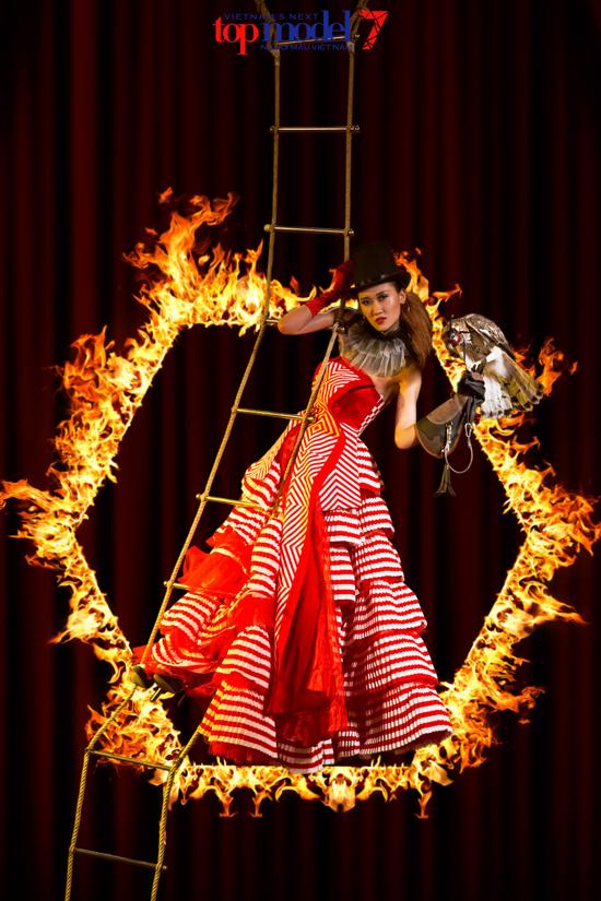 Trong thử thách chụp với vòng lửa, các thí sinh được photoshop quá giả. Với khoảng cách như trong ảnh, hẳn người trong vòng lửa đã bị cháy xém chứ không thể hiên ngang tạo dáng thế này.