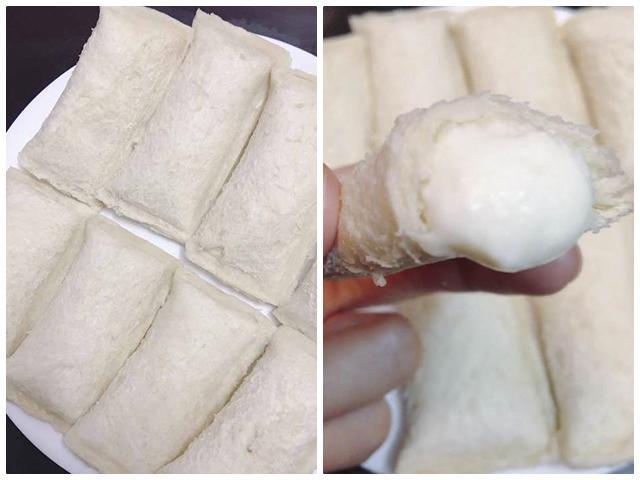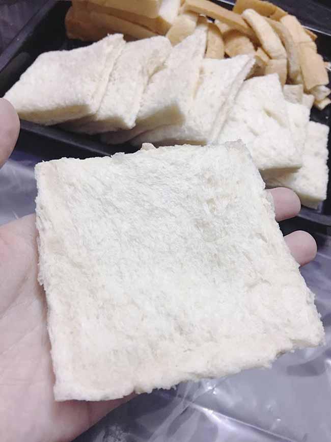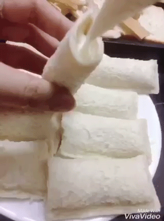 - Bánh sandwich cắt hết vỏ ngoài, phần ruột thì cán mỏng, cán thật mỏng phần rìa hơn. Có thể dùng chai lọ, cốc thủy tinh, chày để cán.