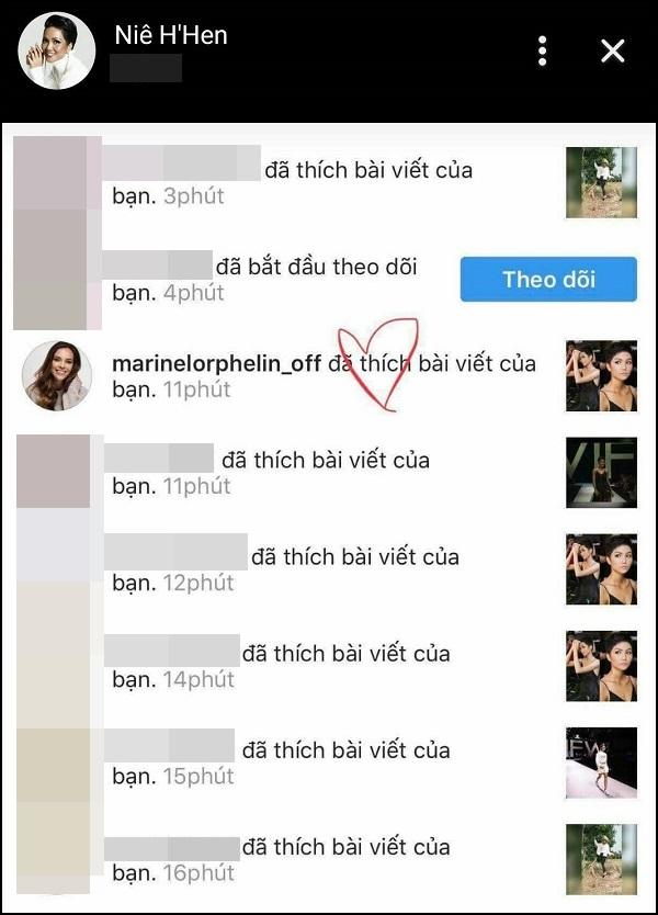 Mới đây, Á hậu Thế giới 2013 - Marine Lorphelin bất ngờ "thả tim" vào hình ảnh mới nhất trên Instagram của H'Hen Niê. Được biết, Marine vốn không "theo dõi" H'Hen Niê trên mạng xã hội, song bằng cách nào đó, cô đã tìm được trang cá nhân của nhan sắc Việt Nam và nhìn ngắm loạt ảnh được đăng tải trên đó.
