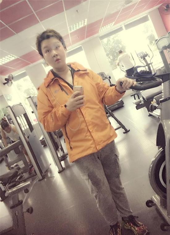 Thân hình hiện tại của 'hotgirl trăm cân'. Mặc dù giữa mùa hè với cái nóng gần 40 độ của Hà Nội, Thủy Tiên vẫn tập luyện với bộ trang phục 'kín từ đầu đến chân'.