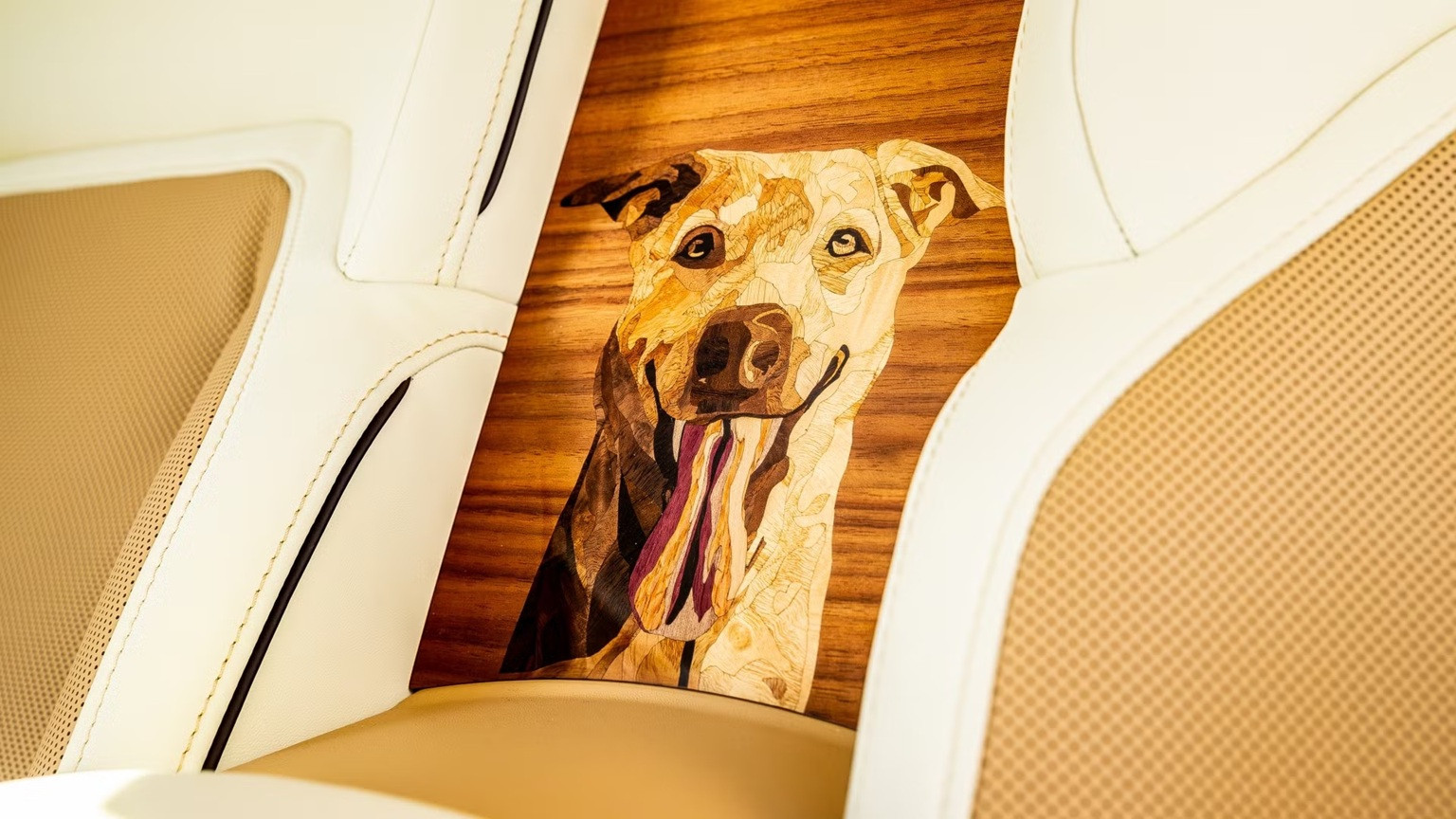 Điểm nhấn đặc biệt nhất nằm ở tấm ốp giữa hai ghế sau: bức chân dung chú chó Bailey được ghép từ hơn 180 mảnh gỗ khác nhau. Các nghệ nhân tốn hơn bốn tháng để lựa chọn veneer, chỉ dùng tông màu và vân gỗ tự nhiên để tái hiện khuôn mặt sống động. Đáng chú ý, đây là lần đầu tiên Rolls-Royce sử dụng bốn loại gỗ hiếm - purple heart, tulipwood, louro faia và pear wood - vì sắc thái độc đáo của chúng.