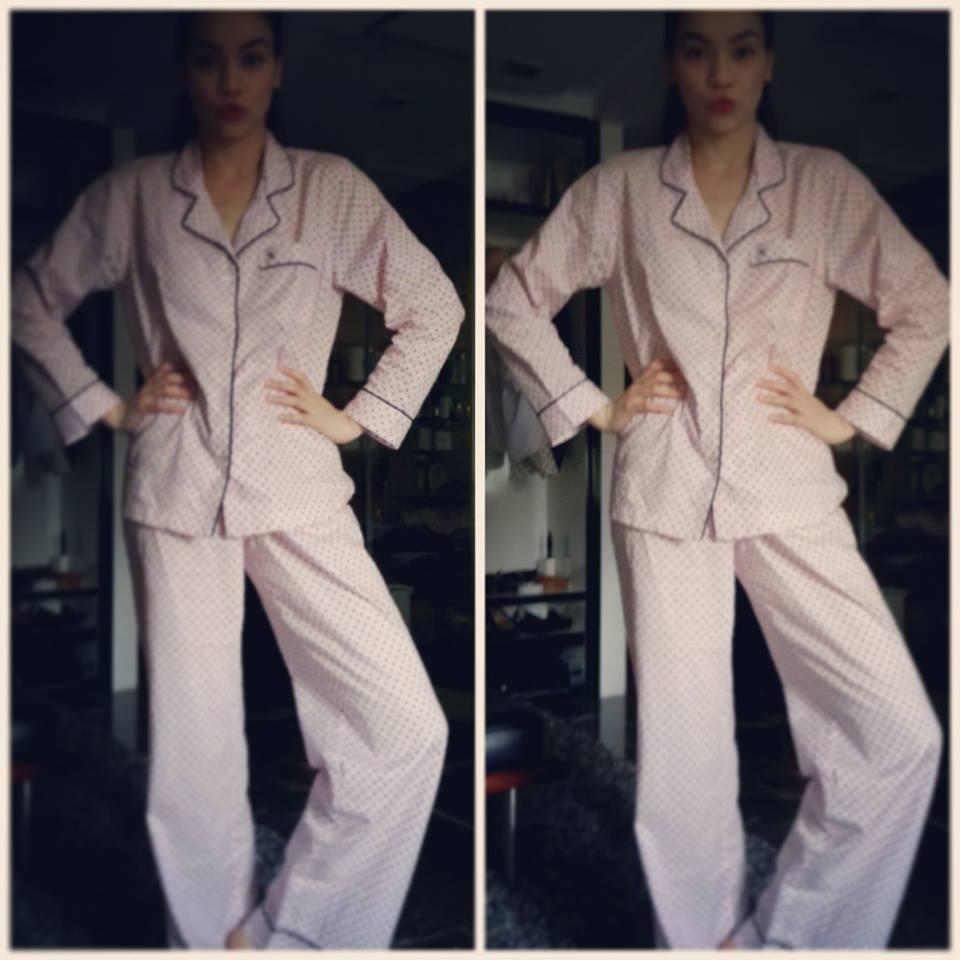 công chúng. Hôm nay, Hồ Ngọc Hà mặc bộ quần áo ngủ chấm bi, màu sáng.